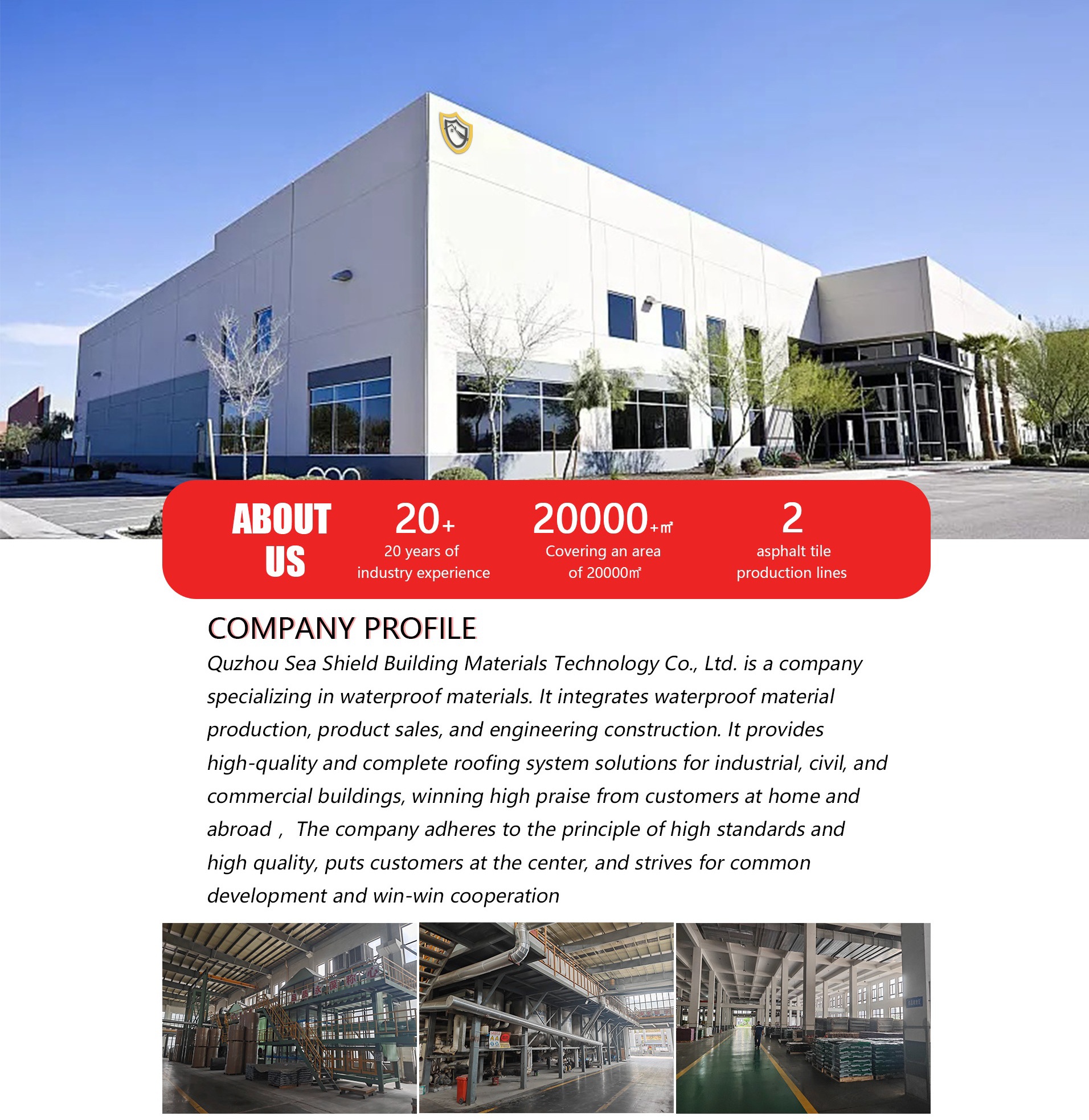 Quzhou Sea Shield Building Materials Technology Co., Ltd. is a company specializing in waterproof materials. It integrates waterproof material production, product sales, and engineering construction. It provides high-quality and complete roofing system solutions for industrial, civil, and commercial buildings, winning high praise from customers at home and abroad ,The company adheres to the principle of high standards and high quality, puts customers at the center, and strives for common development and win-win cooperation